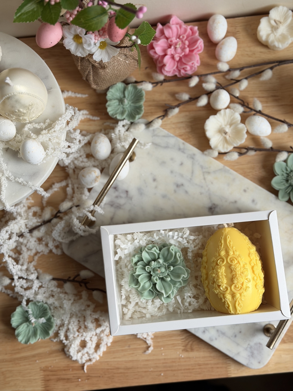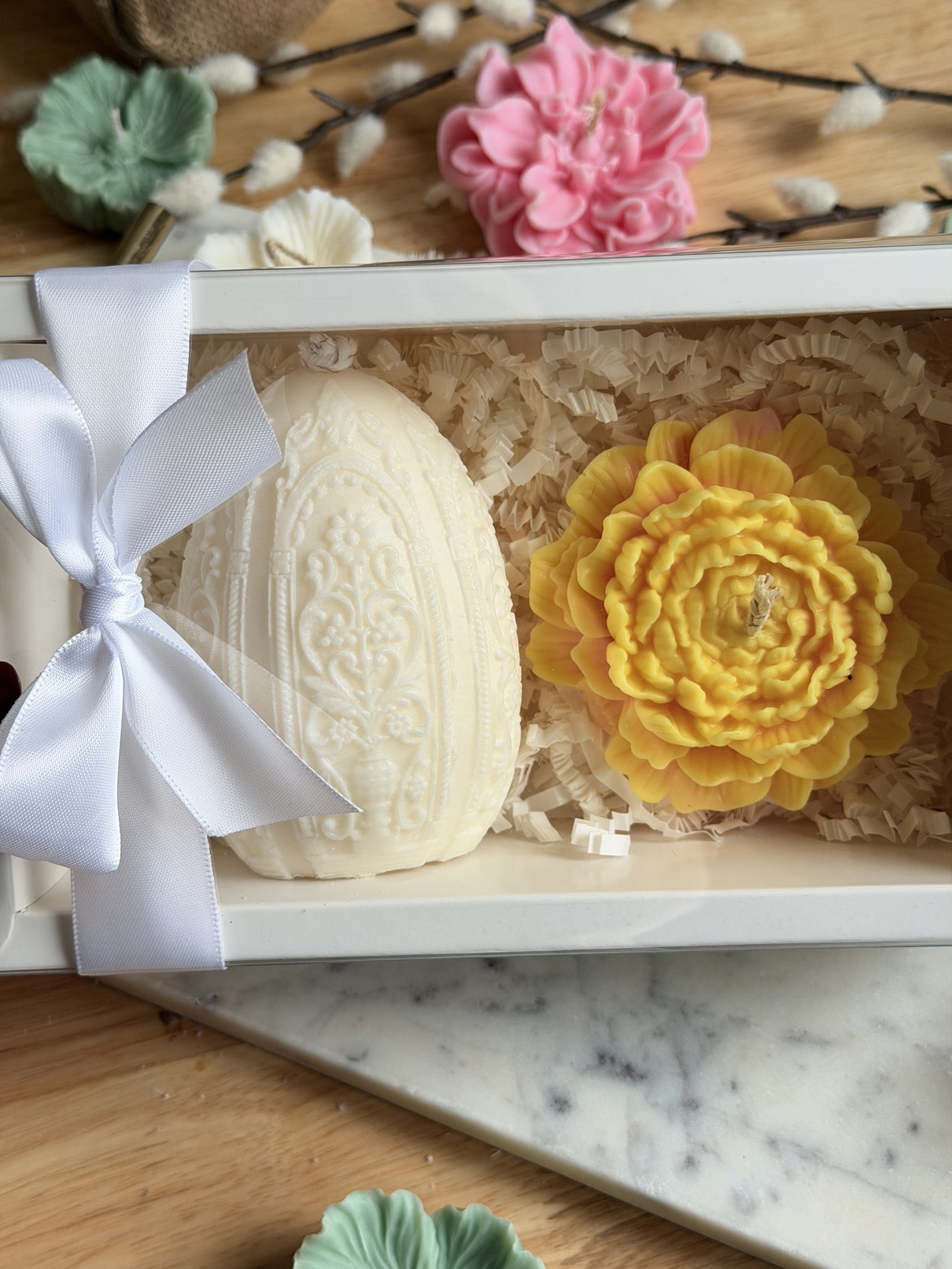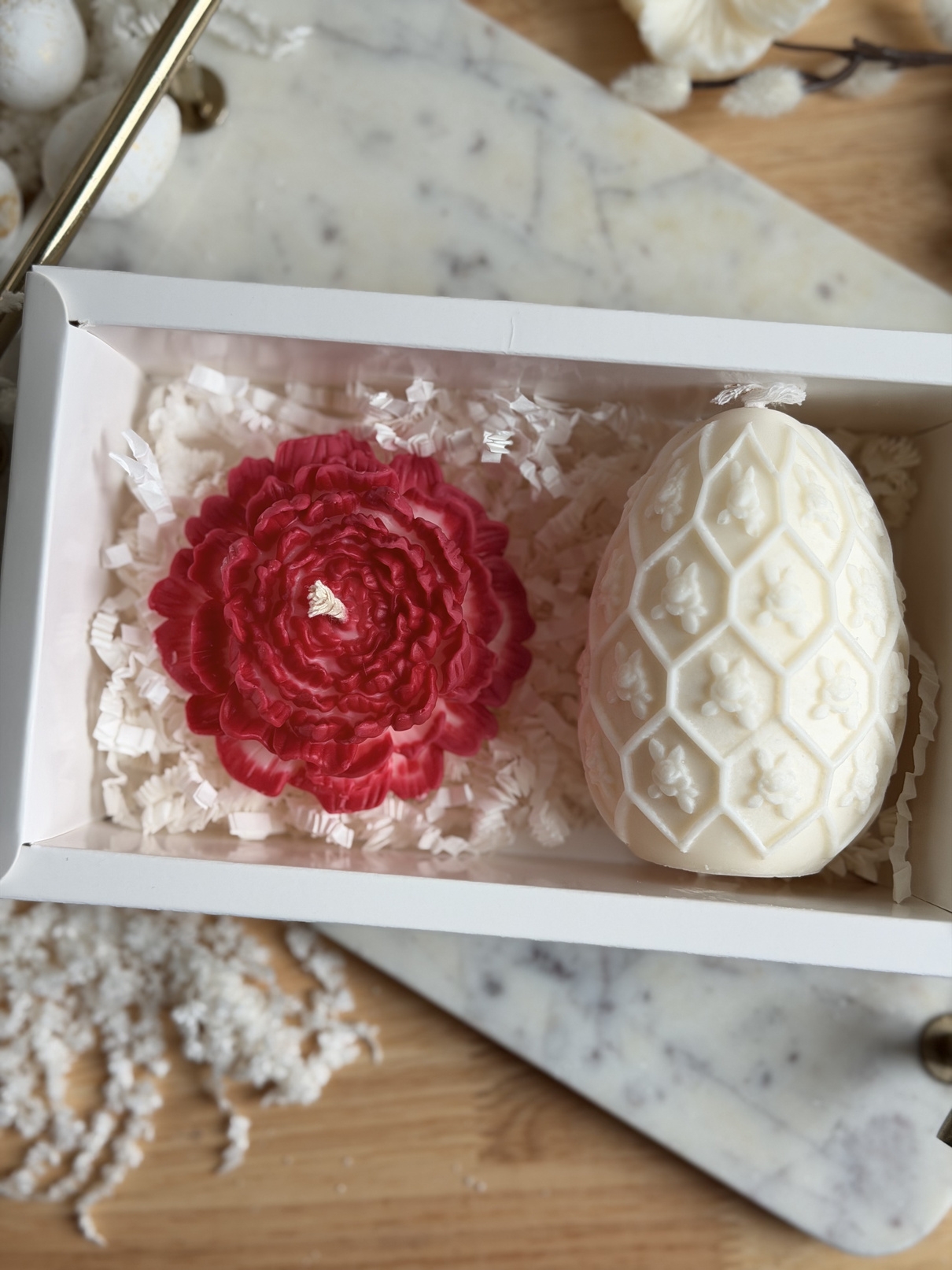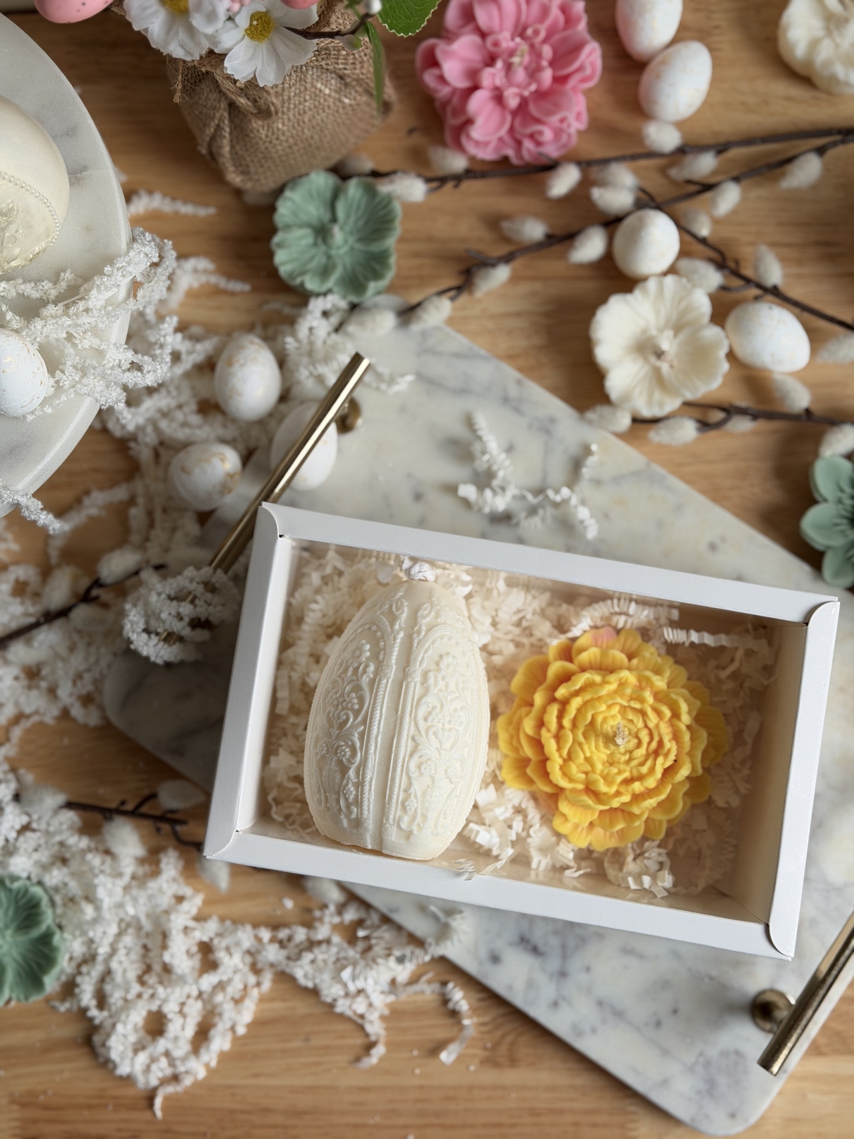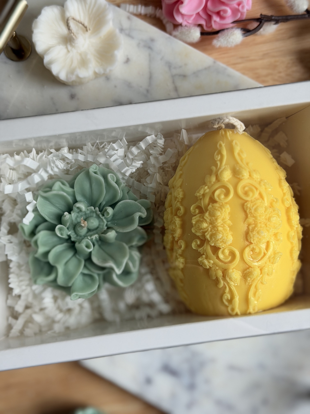 Un set care nu se rezumă la două lumânări, ci la felul în care arată și se simte un spațiu după ce le aprinzi. Boxul aduce împreună o lumânare mare în formă de ou și una florală, ambele sculptate manual, cu detalii care nu sunt perfecte industrial – și tocmai de aici vine farmecul.